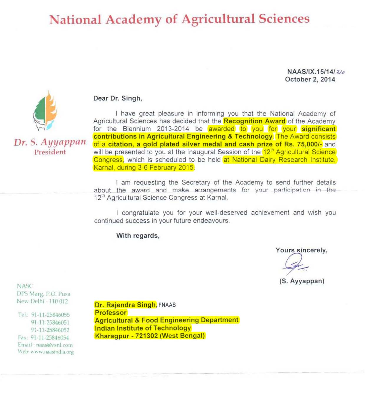 Recognition Award 2014 (National Academy of Agricultural Sciences, India)